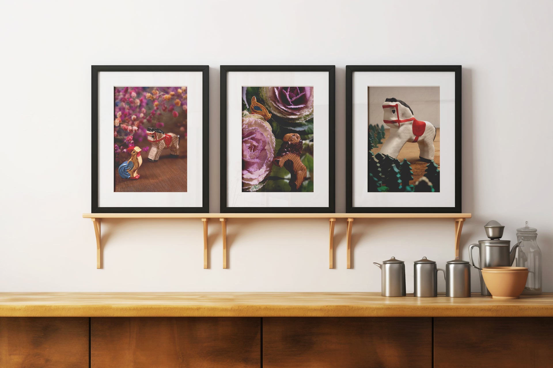 Per chi vuole creare una parete mutevole, l’uso di mensole a profondità ridotta può essere una soluzione ideale: basta appoggiare le stampe e cambiare disposizione ogni volta che si ha voglia di novità, senza vincoli. Anche un mix tra stampe e oggetti d’uso quotidiano, come taglieri in legno, piccoli utensili o contenitori, può aiutare a costruire un racconto visivo coerente ma mai statico.