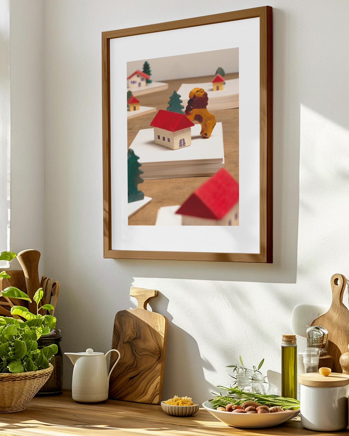 Anche la distanza tra i quadri (se si appendono più elementi) fa la differenza. Spazi regolari tra una stampa e l’altra aiutano a dare ordine e ritmo alla parete. In composizioni verticali, il respiro tra i quadri può essere di 8–15 cm, mentre nelle composizioni orizzontali — come sopra un tavolo da pranzo — conviene lasciare almeno 25–30 cm tra il bordo inferiore del quadro e la superficie. Quando si cercano idee su come abbinare quadri alla cucina, questi accorgimenti diventano fondamentali per valorizzare l’ambiente in modo armonioso e ben proporzionato.