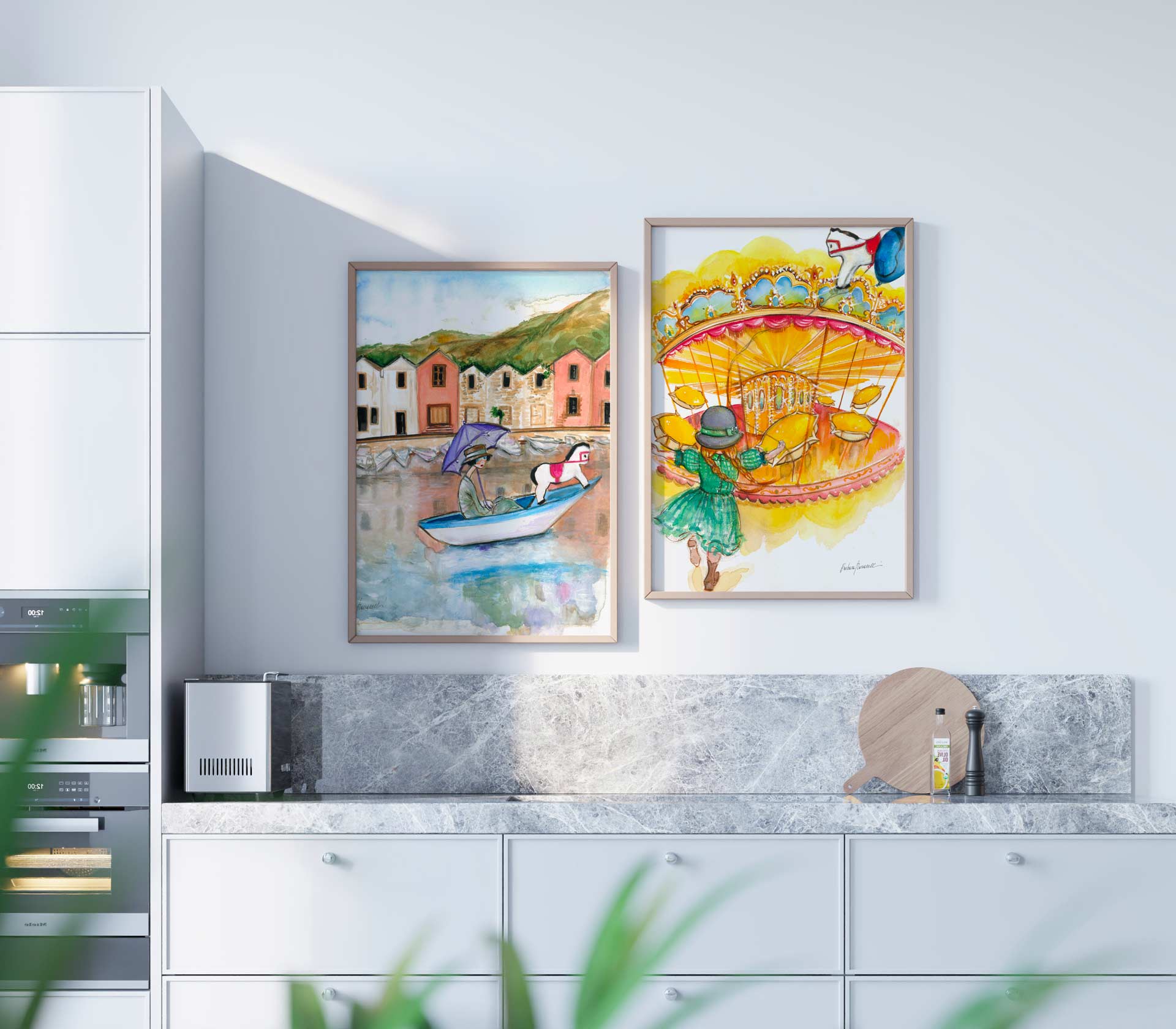 Nelle cucine moderne le pareti spesso restano vuote. A volte per scelta, a volte per prudenza. Ma anche in un ambiente minimal, dove tutto è calibrato, una parete può diventare un punto d’espressione, se trattata con misura e coerenza.Un’idea semplice è scegliere una sola stampa di formato medio, posizionata sopra una madia bassa o un piano d’appoggio libero. Una fotografia dai toni neutri, una grafica geometrica o un’illustrazione con un elemento centrale — come un cavallino stilizzato su sfondo chiaro — possono dare ritmo alla parete senza spezzare l’equilibrio.