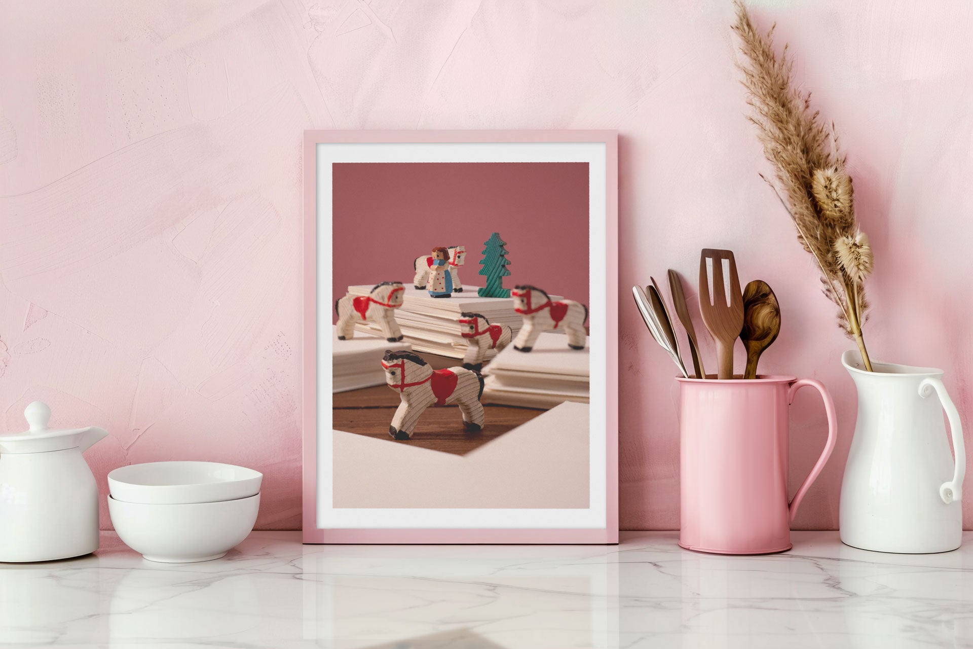 Con pareti rosa cipria, lavanda o albicocca chiaro, presenti spesso in camerette o studi creativi, si possono inserire stampe con azzurro polvere, sabbia, bianco caldo, oppure piccoli accenti corallo o rosso bruciato. In questo contesto, anche il disegno narrativo ha un ruolo importante: animali stilizzati, oggetti sospesi, giocattoli reinterpretati possono diventare veri punti di racconto, perfetti per queste tonalità morbide e sognanti.