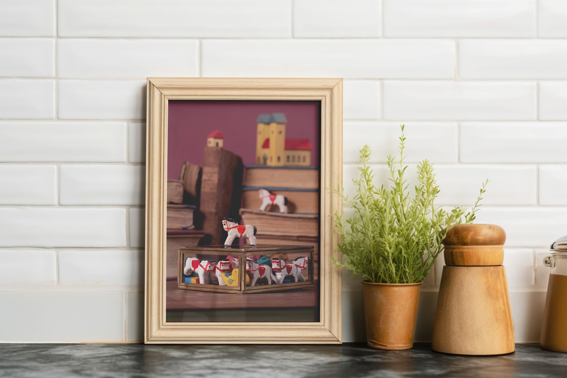 Anche i soggetti delle stampe possono influire. Scene essenziali, oggetti isolati, composizioni ariose o grafiche leggere aiutano lo sguardo a muoversi senza ostacoli. Un cavallino su sfondo neutro, una piccola figura al centro di uno spazio bianco, una geometria semplice o una fotografia in equilibrio possono fare molto più di un’immagine ricca di dettagli o con troppi contrasti.
