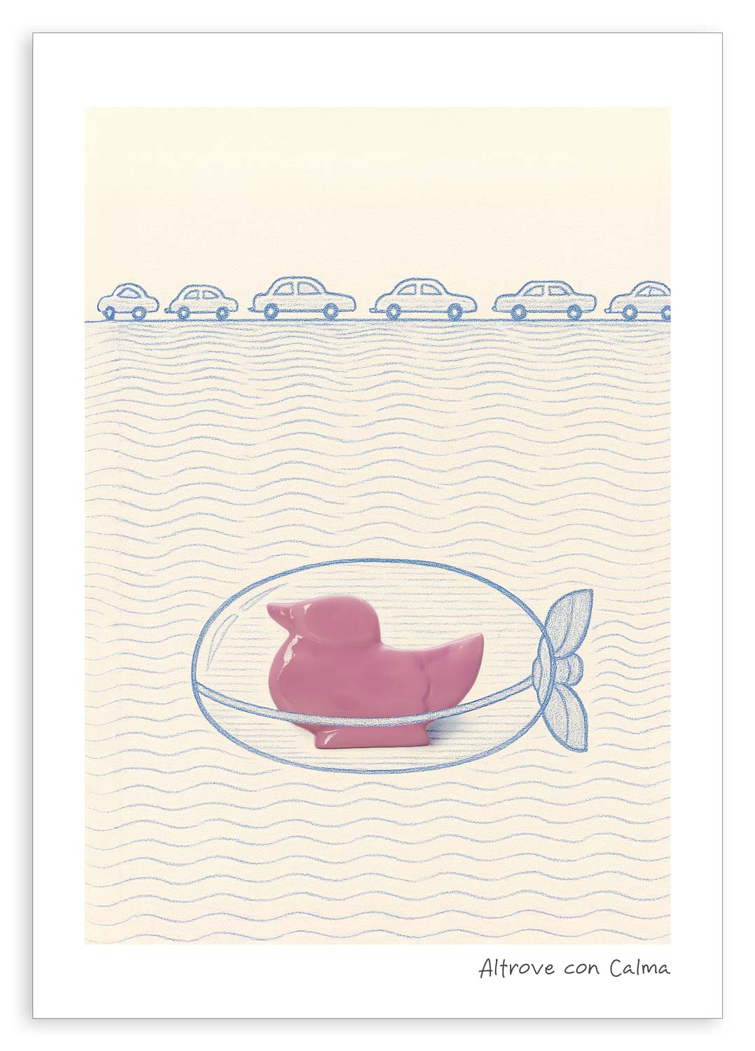 Fotografia originale di un soggetto in ceramica (fatto realizzare dall’autore), integrata con illustrazione/grafica digitale ideata e diretta dall’autore; uso di strumenti di IA a supporto del processo creativo; compositing, correzione colore e finalizzazione eseguiti con software di grafica professionale