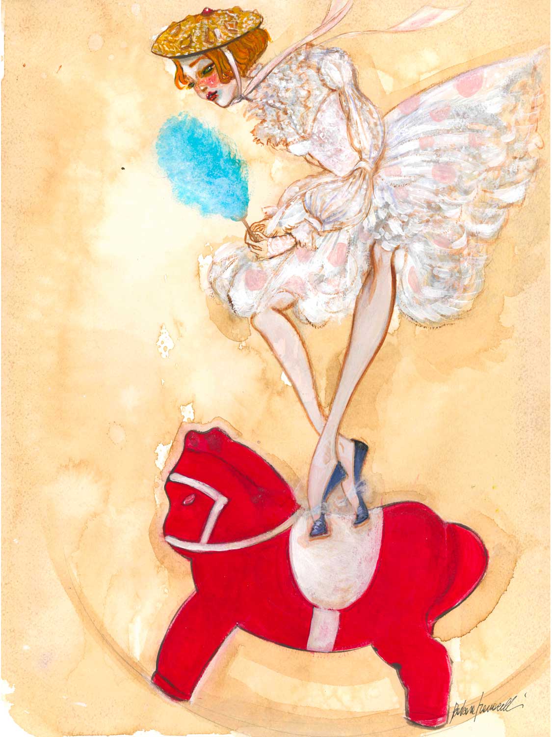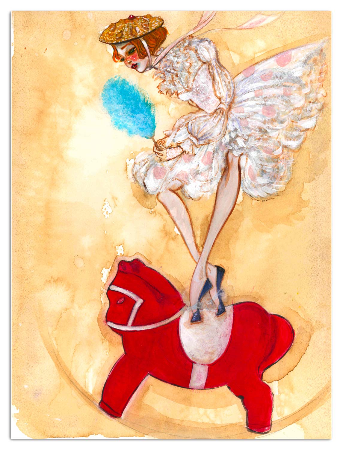 Un'illustrazione che cattura l'eleganza e la grazia di una ballerina, che, con il suo cappello ispirato al tradizionale gioiello del bottone sardo, si libra sopra un cavallino rosso. Il suo abito, delicato e fluttuante, danza in armonia con il movimento, mentre l'azzurro zucchero filato aggiunge un tocco di magia. Un incontro tra la tradizione e l'incanto della danza, dove ogni gesto racconta una storia di bellezza e raffinatezza.