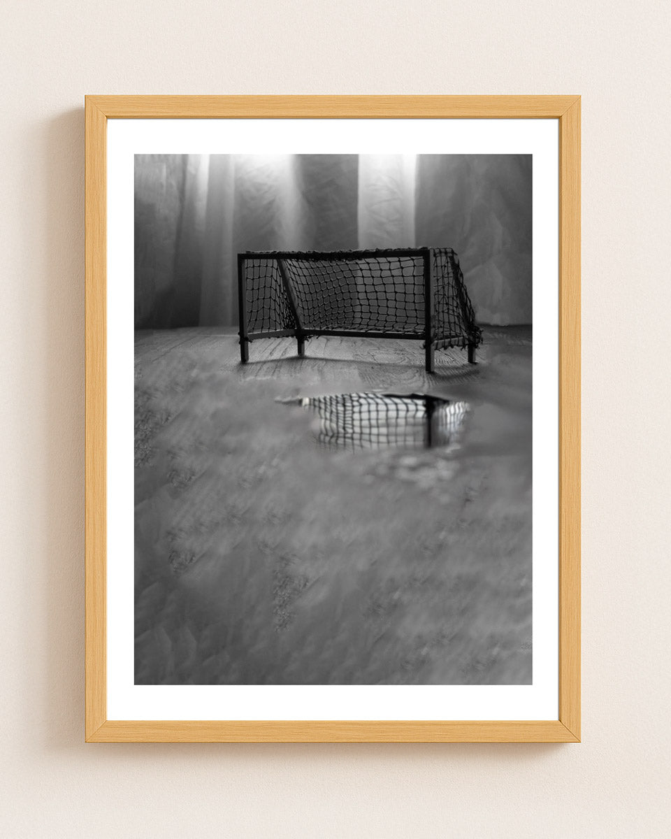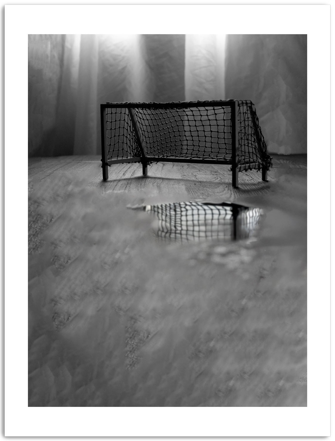 Evoca quelle giornate d’infanzia in cui, con il pallone sotto il braccio, fissavi la pioggia dalla finestra sperando in una tregua, mentre i tuoi genitori scuotevano la testa. Il riflesso della porta nell’acqua racconta di partite rinviate, di campetti improvvisati e di quell’attesa carica di speranza che ogni appassionato di calcio ha vissuto almeno una volta.