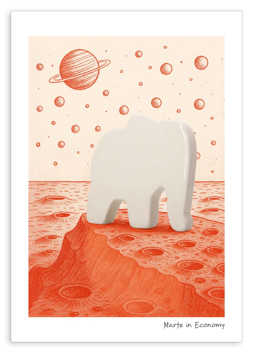 Fotografia originale di un soggetto in ceramica (fatto realizzare dall’autore), integrata con illustrazione/grafica digitale ideata e diretta dall’autore; uso di strumenti di IA a supporto del processo creativo; compositing, correzione colore e finalizzazione eseguiti con software di grafica professionale
