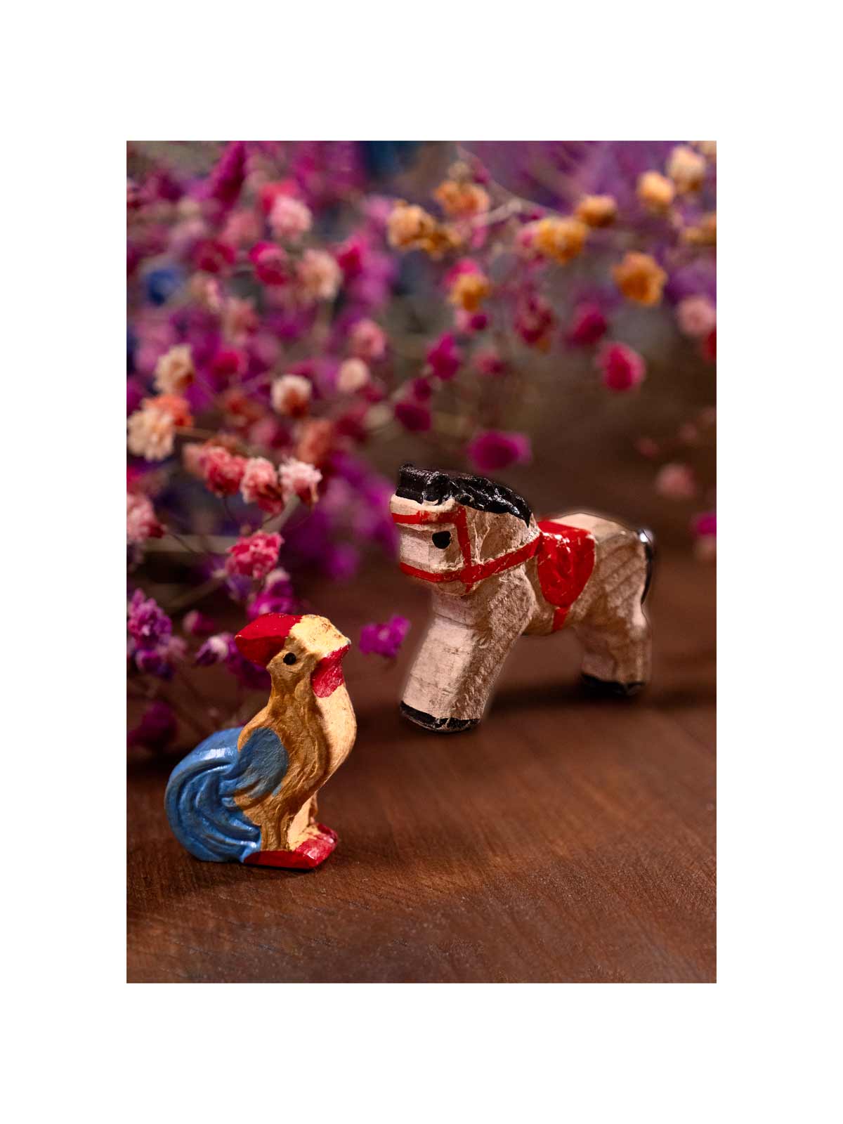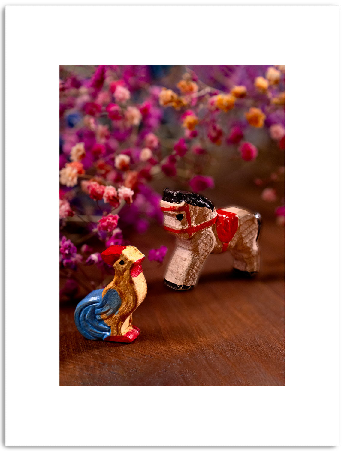 Stampa fotografica 30x40cm, dove in un bosco fatato, un gallo colorato si imbatte in un vecchio amico, un cavallo con cui ha condiviso mille avventure. I due si ritrovano dopo tanto tempo e iniziano a raccontarsi le storie dei giorni passati, come se il tempo si fosse fermato. Questa stampa è un invito a lasciarsi trasportare dalla fantasia e dalle memorie felici, aggiungendo un tocco di magia e vitalità alla tua casa.