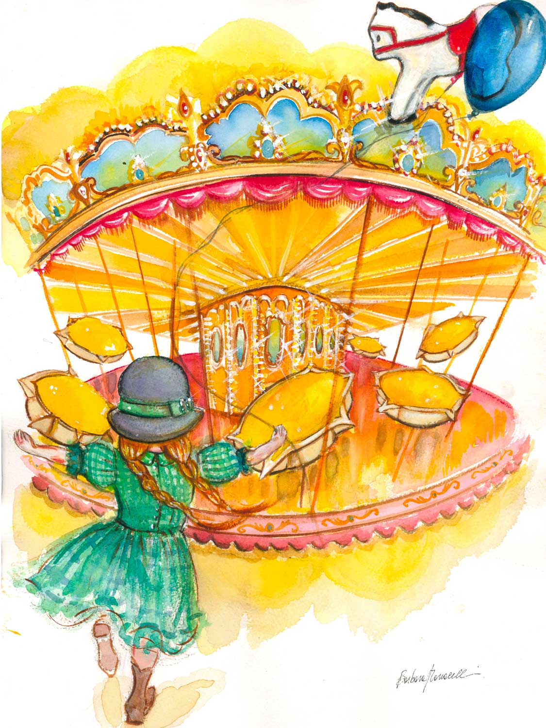 Un'illustrazione che cattura la dolcezza e il movimento di una giostra unica, dove le seggioline a forma di pardule ti avvolgono come un goloso abbraccio. Ogni giro è un'esplosione di colori e tradizione, mentre la bambina, incantata, tiene in mano un palloncino che la porta in un mondo magico di allegria e fascino, dove il gusto e la fantasia si incontrano in perfetta armonia.