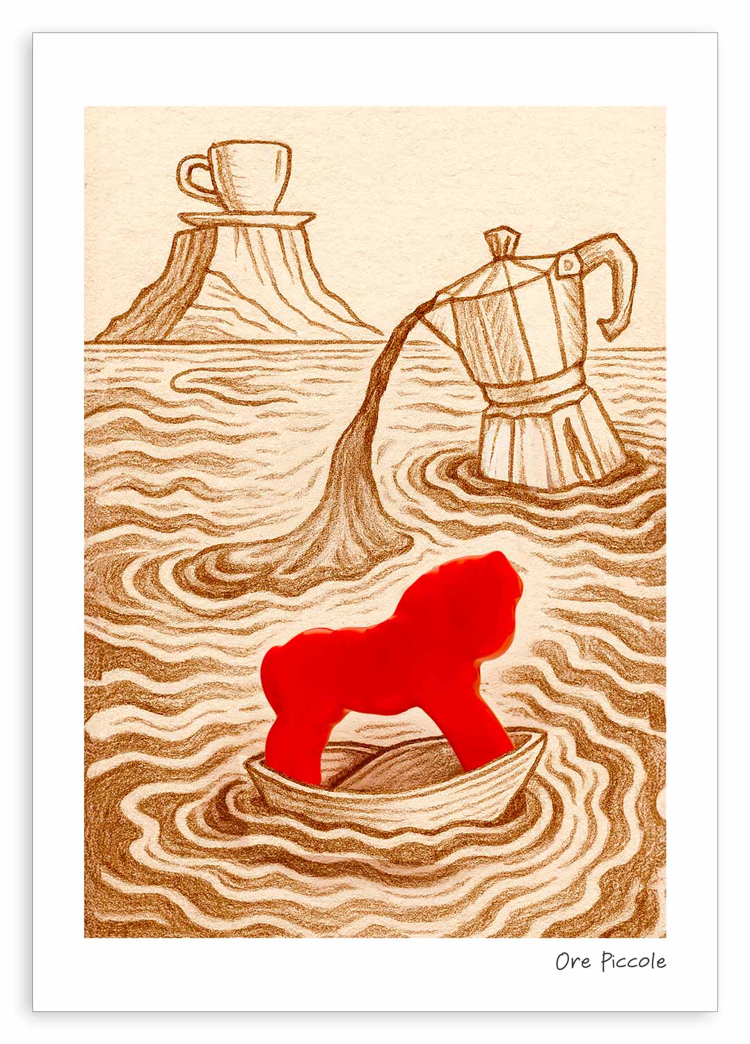 In questa stampa d’arredo il rito quotidiano del caffè diventa un paesaggio surreale: una moka gigante trasforma il mare in un fiume di energia, una tazza si innalza come montagna e un cavallino rosso affronta le onde a bordo di una barca. Un’immagine che mescola sogno e realtà, ideale per accompagnare le ore piccole e i risvegli lenti.